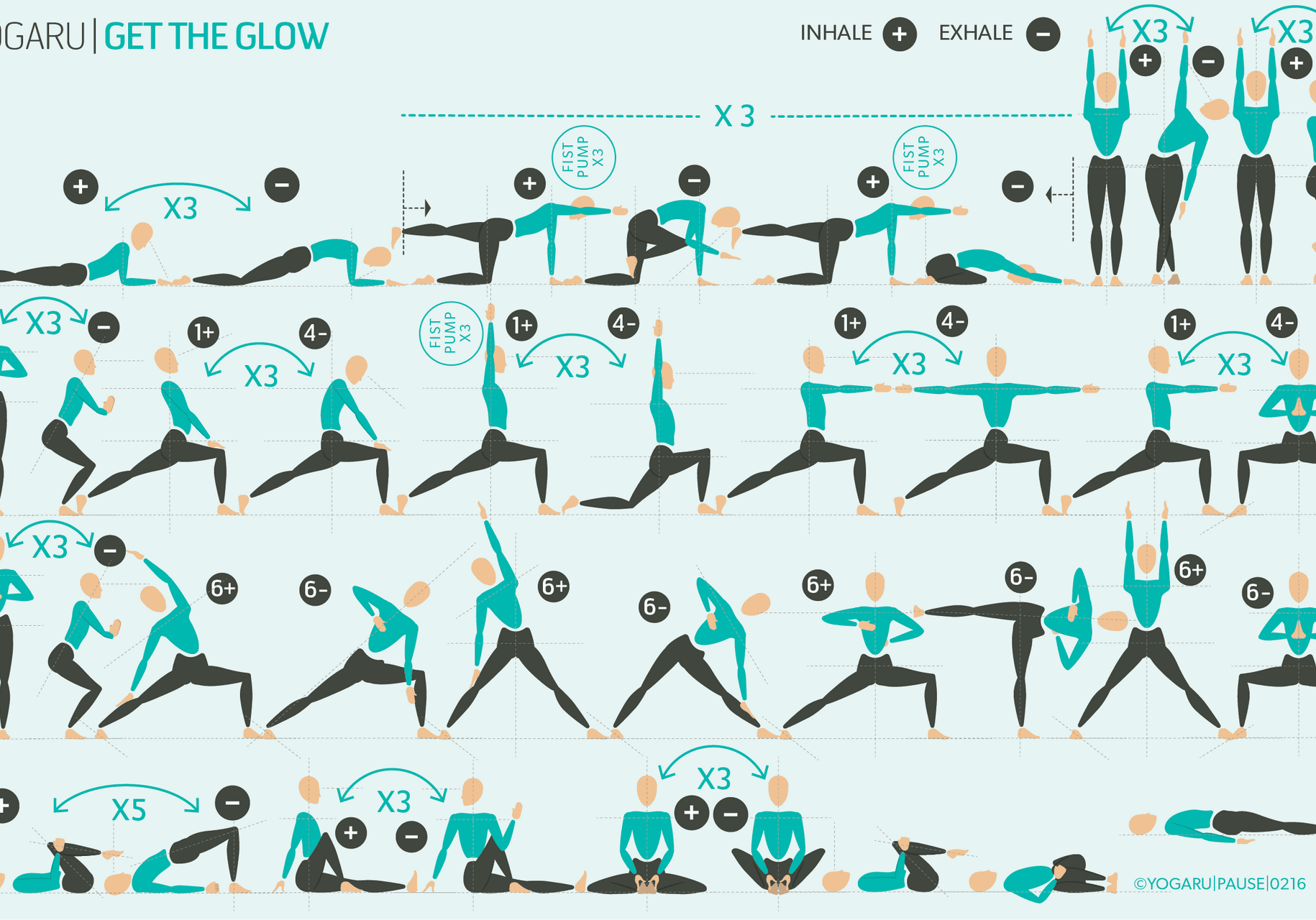 Move slowly to capture all the opportunities to strengthen the muscles. Inhale is indicated with a ‘+’, exhale is a ‘-”.